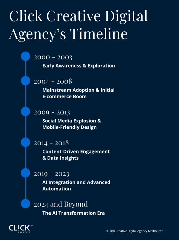 Technology Path: The Click team started off with our own Content Management System (CMS), but soon realised more popular platforms like Joomla and WordPress made it easier to build and manage websites without advanced coding. E-commerce platforms like eBay and Amazon also gained popularity.